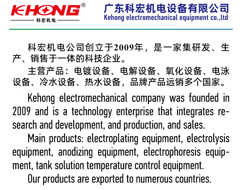 广东科宏机电设备有限公司位于粤港澳大湾区,水陆交通便利,距深圳宝安国际机场或虎门高铁站约30分钟路程。公司初创于2009年,是一家集研发、生产、销售、服务于一体的科技企业。主营产品:表面处理设备、冷水设备、热水设备,以及承接相关产品的维修保养业务,主要涉及五金、塑胶、化工、电子、冶炼、机械、军工、环保等领域。本着以先进技术及科学管理,塑造优越的产品质量,持续深入市场实际需求,以真诚的服务及务实求新的态度为基本,为广大用户提供真正更具价值的产品与服务。科宏机电设备数项创新技术获得国家专利证书,品牌产品远销多个国家。中国地区办事处:北京、四川成都、湖南邵阳。